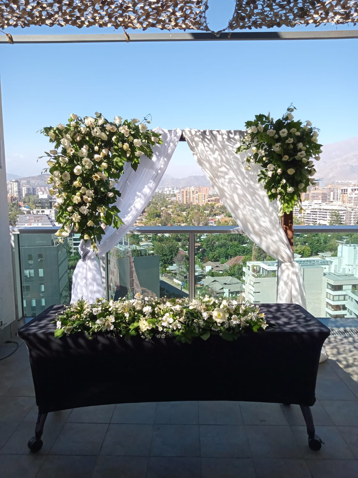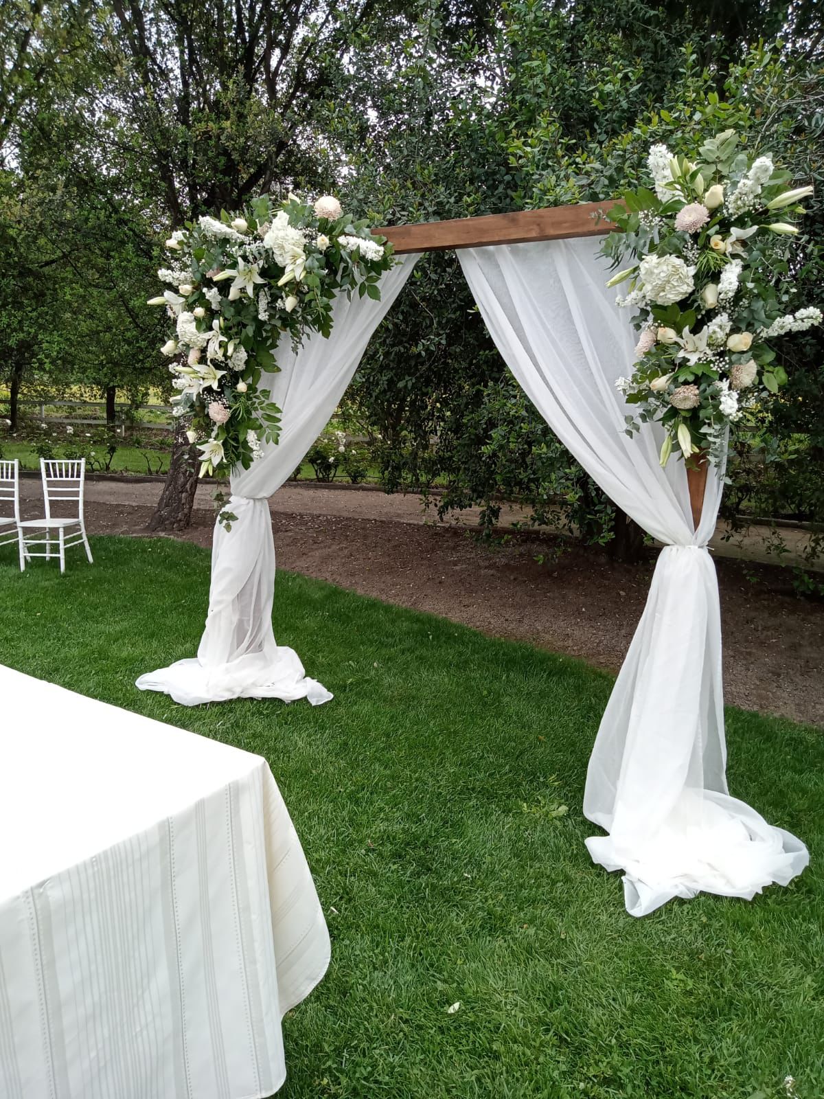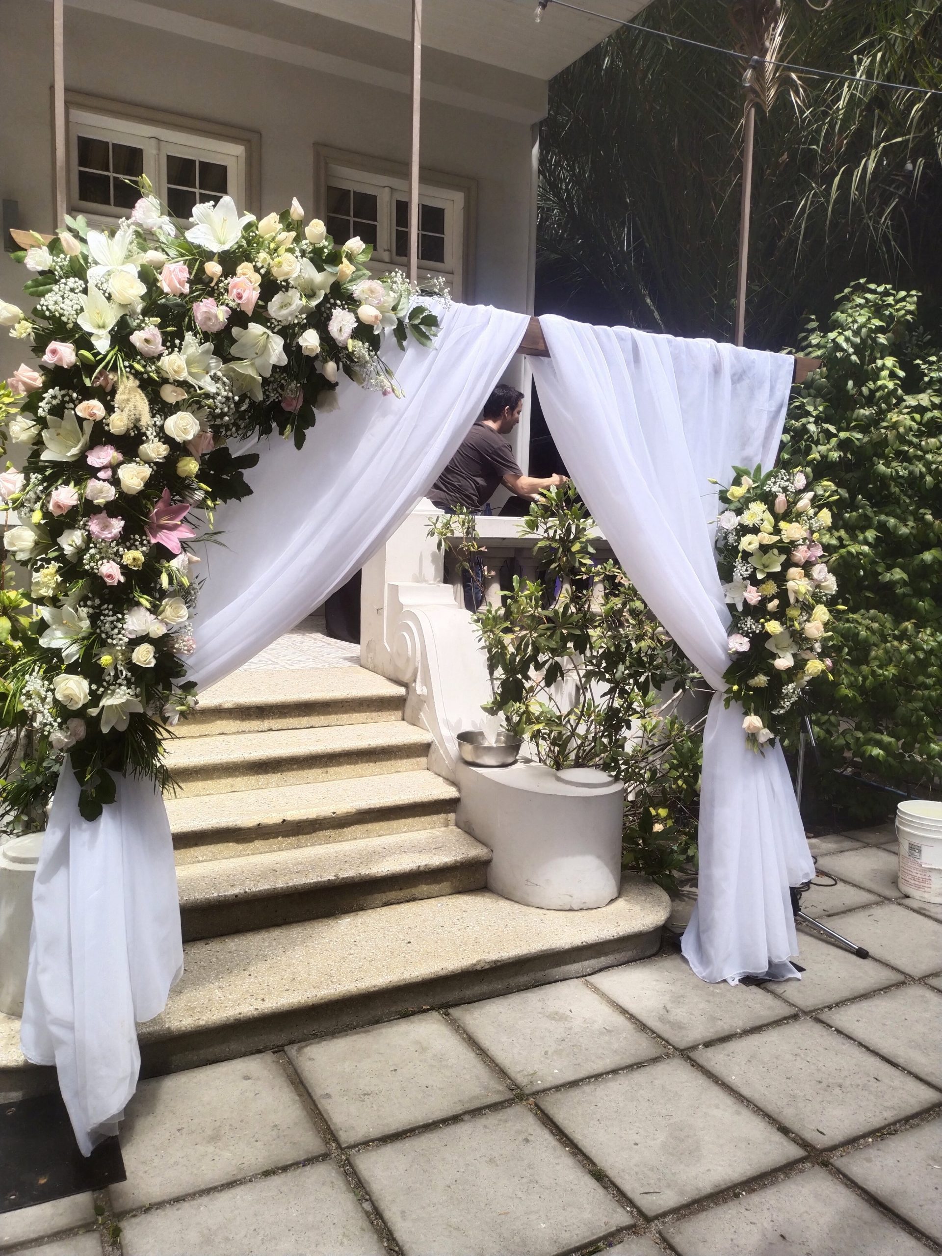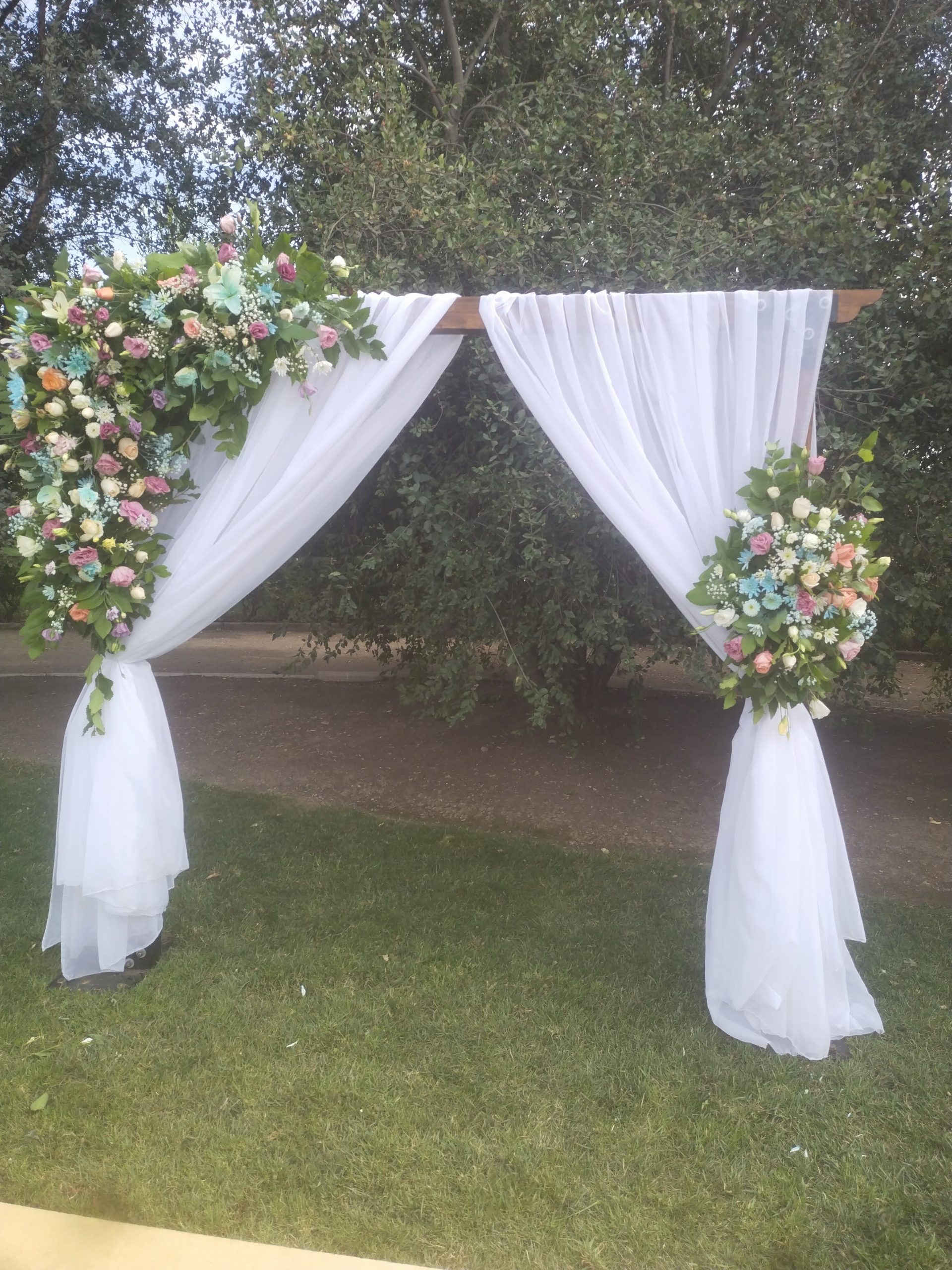 Arco rectangular decorado con velo, y 2 explosiones florales.