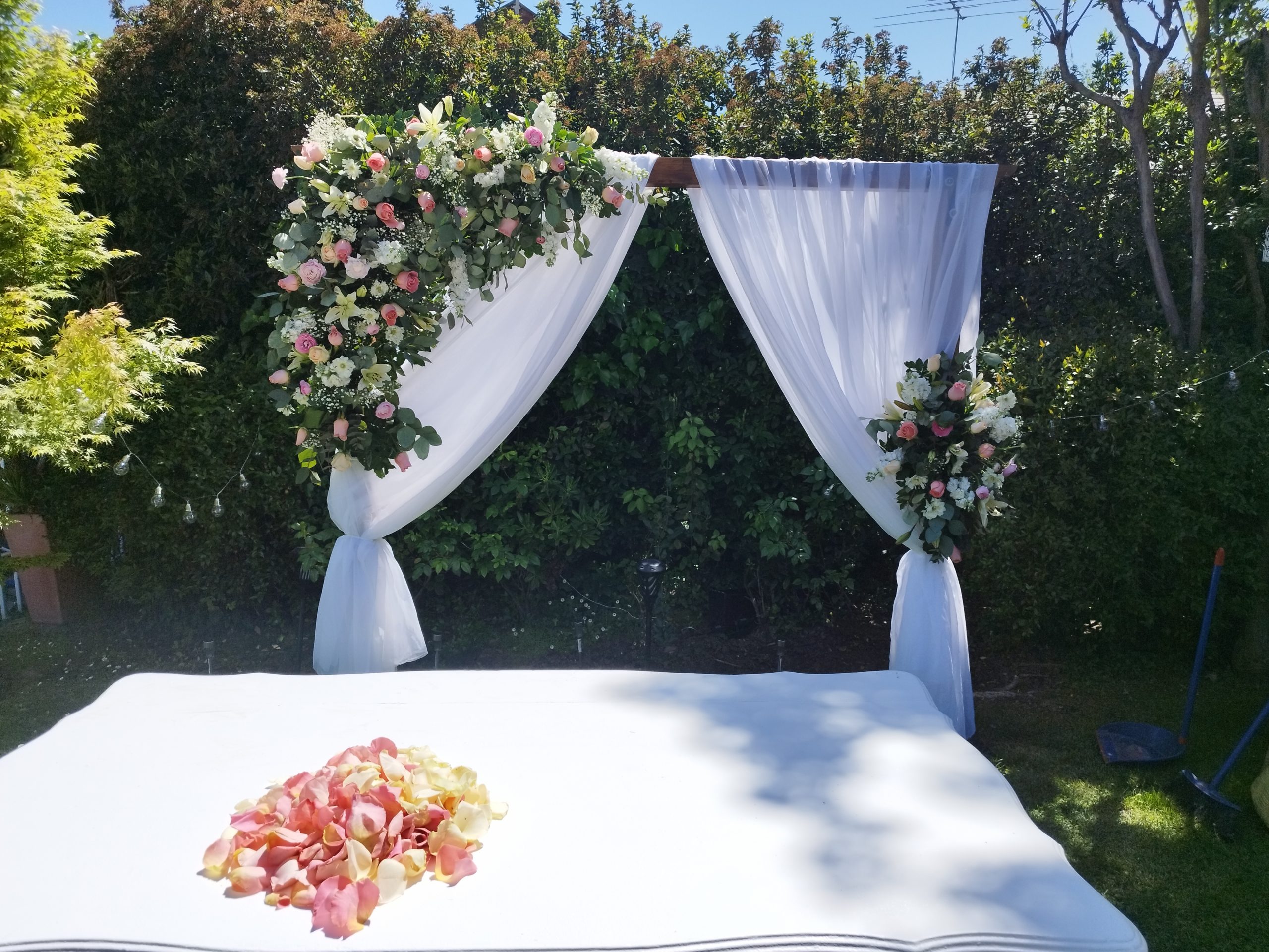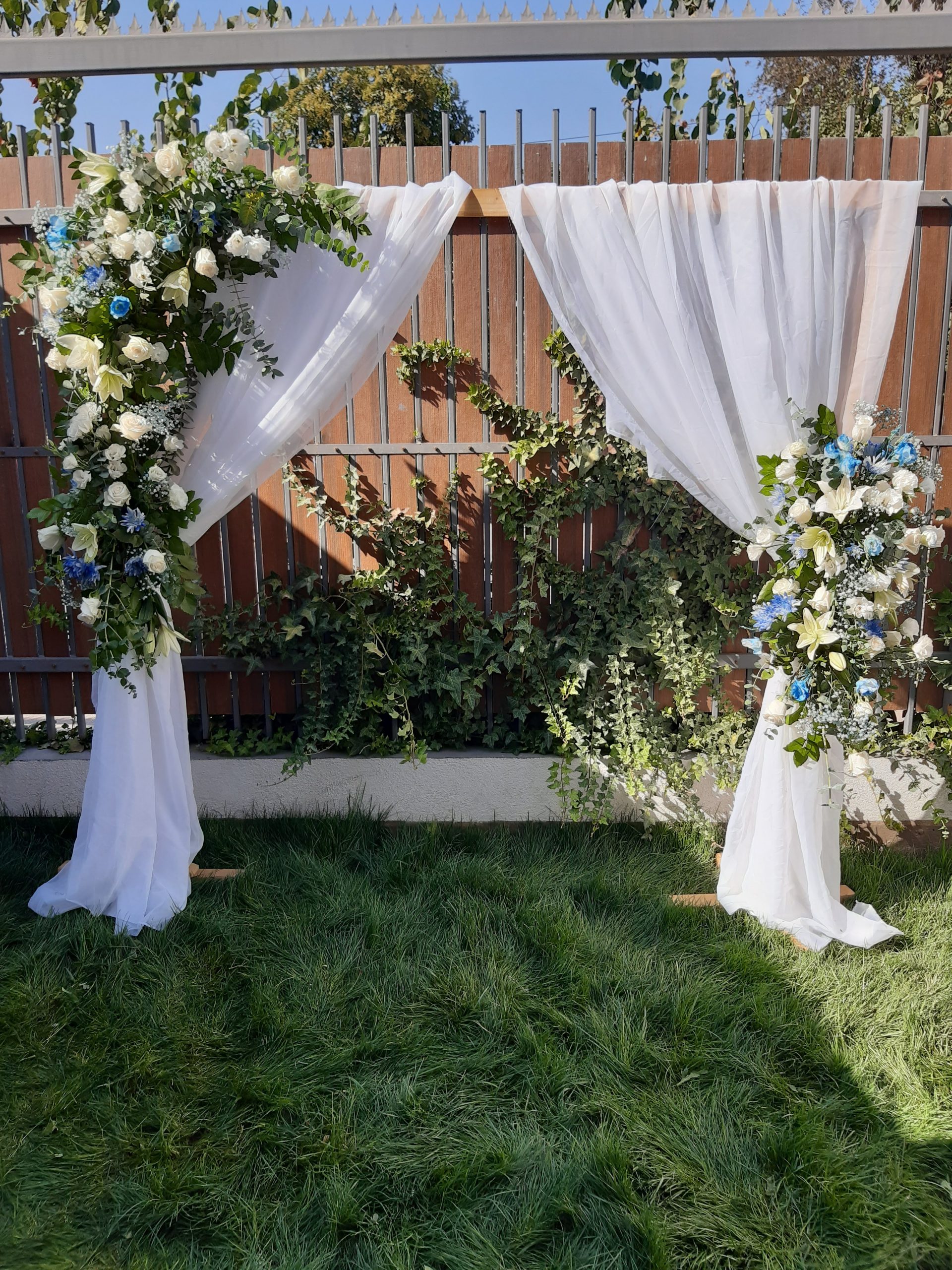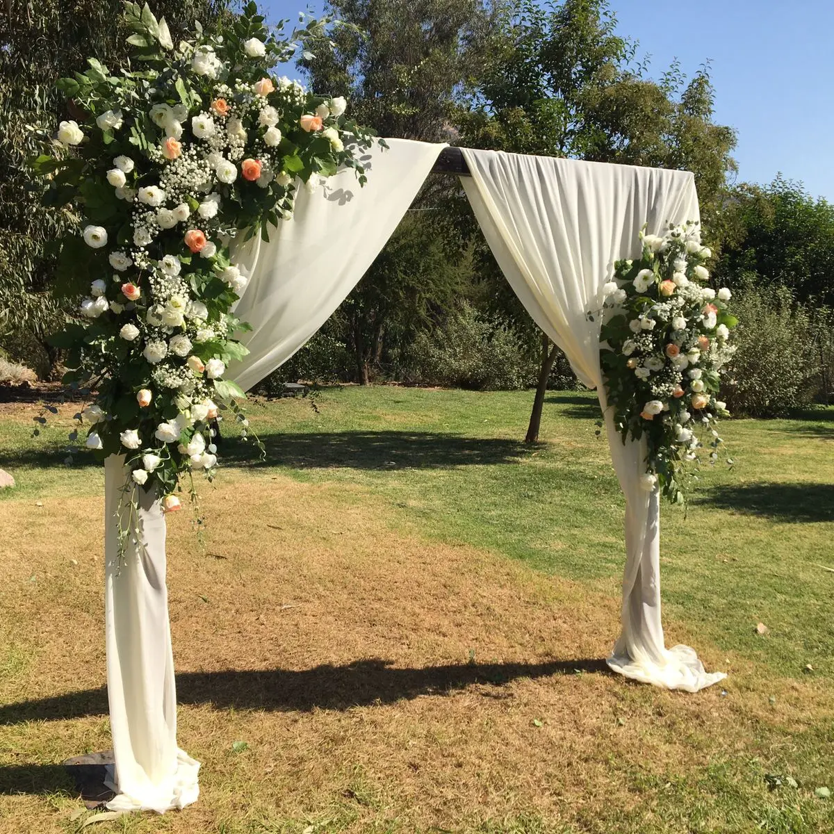 Arco rectangular decorado con velo, y 2 explosiones florales.